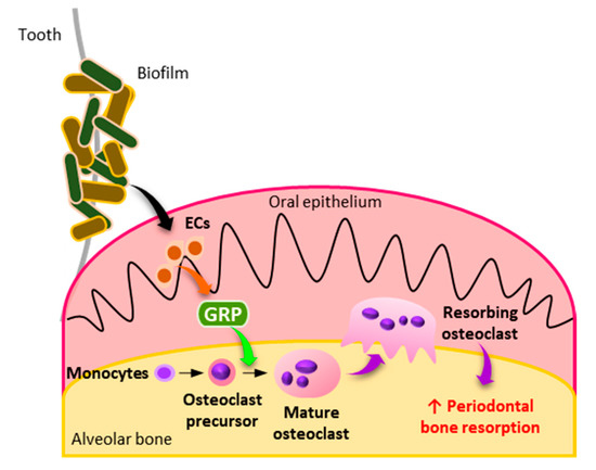 Gingival ECs are the first line of host defense as they function as a physical barrier against invading pathogens. Recent studies have demonstrated that P. gingivalis can invade ECs to activate resident periodontal tissue cells which, in turn, affects cell proliferation, differentiation, and migration of precursor immune cells into the wound environment [30,31]. These responses lead to the production of various inflammatory and immune mediators that contribute to the destruction of tissue components including bone [30]. A recent study showed that oral bacteria and their components stimulated periodontal ligament cells, which, in turn, produced IL-6 that induced the accumulation of T helper 17 (TH17) cells and exFoxp3 TH17 cells in the oral mucosa [32]. These are a subset of T cells with pro-osteoclastogenic properties. However, this experiment was the first to identify some level of cell-to-cell communication between ECs and macrophages in promoting osteoclast differentiation in the periodontal microenvironment. Our present data suggest that the abnormal GRP in periodontitis-affected ECs is linked to pathological activation of osteoclastogenesis. It also indicates that communication exists between the vasculature and bone and GRP may act as a link between periodontal disease and cardiovascular disease.