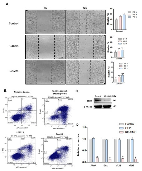 Cell migration is a multi-step process that plays an important role in tumorigenesis. To evaluate the effect of SMO and GLI inhibitors on the migration of LMS cells, a wound-healing assay was performed. The results showed that the SMO and GLI inhibitor significantly decreased the migration capacity in LMS cells (Figure 3A) (p < 0.05). An apoptosis assay was performed and demonstrated that the SMO and GLI inhibitors induced apoptosis in LMS cells (Figure 3B), and the GLI inhibitor showed a more potent effect compared to the SMO inhibitor.