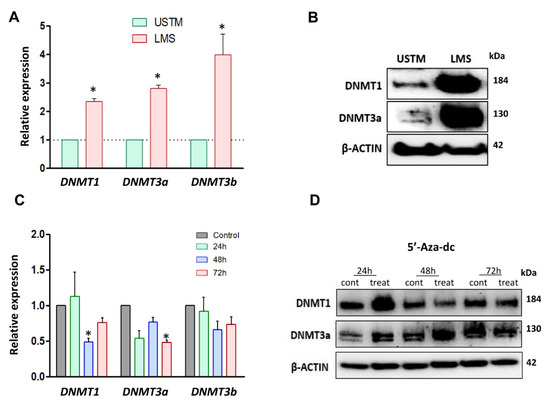 RNA and protein expression levels of DNMTs were evaluated in LMS cells in response to 5′-Aza-dc treatment. The RNA expression of DNMT3a and DNMT3b was significantly decreased in 5′-Aza-dc-treated LMS cells compared to the control (p < 0.05) with 48 and 72 h of the treatment (Figure 4C). The protein expression of DNMT1 and DNMT3a in LMS cells was decreased after 72 h of the treatment with 5′-Aza-dc (Figure 4D).