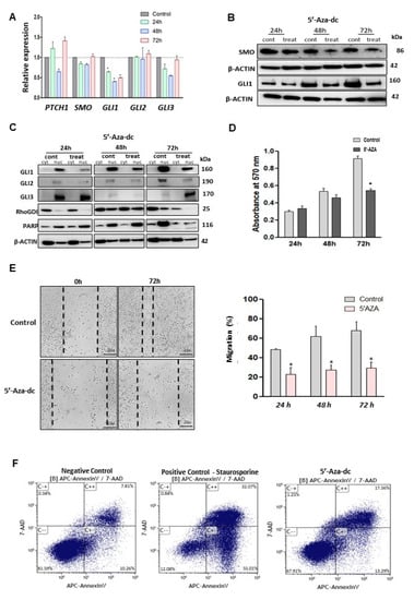 DNMTs inhibition and its effects on GLI1 expression, cell proliferation, cell migration and apoptosis induction. (A) PTCH1, SMO, GLI1, GLI2, and GLI3 expression after 5′-Aza-dc cell treatment compared to control (no treated cells). (B) Protein expression of SMO and GLI1 with or without 5′-Aza-dc treatment. (C) GLIs protein expression in cytoplasm and nuclear cell compartment, after 24, 48, and 72 h of 5′-Aza-dc treatment. (D) MTT assay in the presence or absence of 5′-Aza-dc for 72 hs. (E) Wound healing assay (20×) for cell migration measured after 72 h of 5′Aza treatment, and quantification analysis of percentage of migration. (F) Apoptosis assay using annexin V stain after 72 h of 5′-Aza-dc treatment. Staurosporine treatment for 24 h was used as a positive control. * p < 0.05.