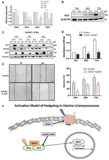 Effects of combination treatment with 5′-Aza-dc and Gant61 on HH signaling in LMS cells. (A) RNA expression of SMO, GLI1, GLI2, and GLI3 with combination treatment or without treatment. (B) GLI1 protein expression in the presence or absence of the combination treatment. (C) GLI1 protein expression in the cytoplasm and nuclear compartment. (D) Measurement of cell proliferation using the MTT assay. (E) Wound healing assay after 72 h of the combination treatment and quantification analysis of the percentage of migration. * p < 0.05. (F) Proposed model of HH signaling pathway activation in uterine LMS cells. The expression of SMO and GLI is deregulated and GLI nuclear translocation is increased, and by targeting these molecules we were able to inhibit the LMS phenotype. We also proposed that the epigenetic mechanism is involved in the hyper-regulation of GLI1 expression. The deregulation of SMO and GLI1 is represented in yellow and blue, respectively.