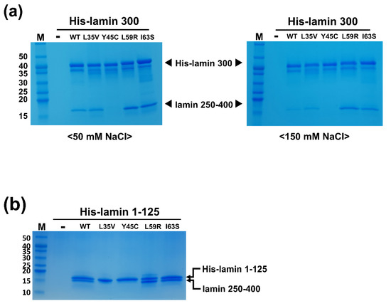 We purified four mutant proteins based on the lamin 300 fragment (residues 1-300) as the coil 1a-containing proteins to examine the eA22 interaction. The mutant proteins were expressed as a dimeric unit in solution, like the wild-type fragment. As previously described, we performed the His-tag pull-down assay to evaluate the strength of the eA22 interaction [18]. The His-tagged mutant lamin 300 fragments were incubated with the C-terminal part of coil 2 (residues 250-400) in a low-salt buffer containing 50 mM NaCl or a high-salt buffer containing 150 mM NaCl. The Y45C mutation reduced the binding strength of the eA22 interaction in both buffers (Figure 2a). In contrast, L59R and I63S increased the eA22 interactions in both buffer conditions (Figure 2a). The L35V mutation did not affect the binding strength of the eA22 interaction, based on the experiment using the lamin 300 fragment. However, the L35V mutation in the lamin 1-125 fragment showed a substantial reduction in the eA22 interaction (Figure 2). Thus, our results potentiated the hypothesis that the higher or lower strength of the eA22 interaction is closely related to the laminopathies.