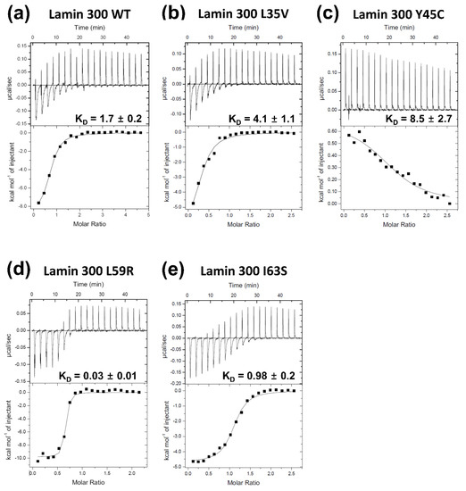Isothermal titration calorimetry analysis for the binding affinity between the lamin 300 fragments ((a) WT; (b) L35V; (c) Y45C; (d) L59R; (e) I63S) and the coil 2 fragment (residues 250–400). The top panels represent the raw measured heat changes (μcal/s) as a series of peaks corresponding to a function of time resulting from the titration of each lamin 300 fragment (20 μM; 370 μL) with 19 injections of the coil 2 fragment (160 μM; 2 μL per one injection). The bottom panels show the titration isotherm resulting from the raw data in the top panels.