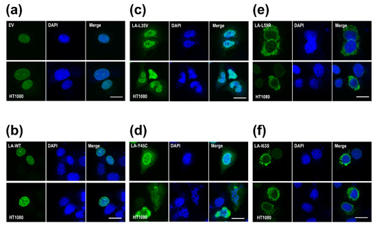 Nuclear shapes and distribution of the wild type ((a) empty vector and (b) WT) and mutants ((c) L35V, (d) Y45C, (e) L59R, and (f) I63S) of lamin A. The immunofluorescence assay visualized nuclear morphology after the transfection of wild-type or variants (L35V, Y45C, L59R, and I63S) of lamin A into HT1080 cells. For visualization of the nuclear membrane, cells were stained with an anti-lamin A/C antibody (green) and DAPI for DNA (blue). The merged images of lamin A/C and DNA are displayed on the right (merge). Scale bar: 10 μm.