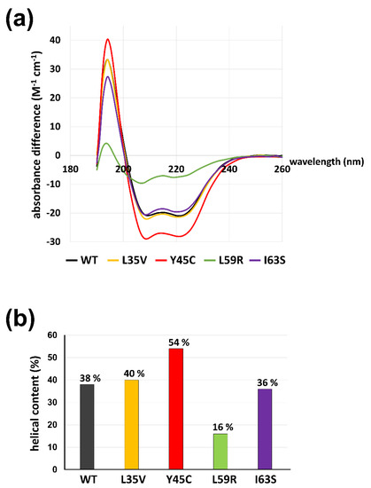 The α-helical contents of lamin 1-125 fragments (WT, L35V, Y45C, L59R, and I63S). (a) The circular dichroism (CD) spectra were recorded at a protein concentration of 1 mg/mL. Wild-type and variant proteins are colored differently (WT; gray, L35V; yellow, Y45C, L59R; green, I63S; violet). Estimated helical contents of lamin 1–125 fragments are presented in (b).