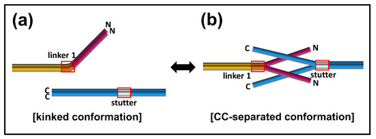 To account for the conformational transition of coiled-coil dimers both in the N-terminal of coil 1a and the C-terminal of coil 2 parts in the eA22 interaction, we closely examined the structures of the lamin 300 fragments and vimentin (residues 99–189), both of which contain coil 1a, coil 1b, and flanking linker L1 (Figure 1b and Figure S5) [18,40]. Both structures exhibited all α-helical conformation in the coil 1a and coil 1b regions, including the flanking linker that did not follow the heptad rule. However, the two structures presented quite a different arrangement in terms of coiled-coil dimer formation and bending of α-helices. We noted that the abrupt bending was found at the linker L1 region connecting coil 1a to coil 1b in the continuous coiled-coil structure and that linker L1 does not follow the heptad rule (Figure 1b). In contrast, no abrupt kink was found in the vimentin structure with separation of the coiled-coil in the coil 1a region, also caused by the broken heptad rule at the linker (Figure S5). The structural comparison suggests that the kink at the linker compensates for the broken heptad rule, resulting in the formation of stable coiled-coil interaction throughout the coil 1a and coil 1b regions. Otherwise, the coiled-coil would be separated without the kink at the linker region. Thus, our findings suggest a dynamic equilibrium between two conformations: kinked and CC separated conformation.