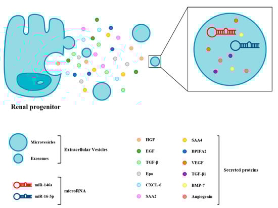 Renal progenitor-based therapies represent a promising new frontier in the treatment of renal diseases, as several studies suggest that they improve kidney function following injury []. However, injecting renal progenitors directly into animal models of kidney injury to induce tissue regeneration presents important limitations that have been exposed elsewhere []. These caveats could be circumvented thanks to the newly exploited properties of renal progenitors, which is their capacity to secrete trophic factors, cytokine or chemokines that efficiently mediate kidney repair in a paracrine or autocrine manner (Figure 2). Kenji et al. reported that the intraperitoneal injection of culture supernatant obtained from adult rat kidney progenitors significantly suppressed the tubular cell apoptosis of residual renal cells, diminished the inflammation and promoted the proliferation of immature cells in an experimental IRI model through the release of HGF (hepatocyte growth factor), EGF (epidermal growth factor), TGF-β and Epo (erythropoietin) []. Indeed, the therapeutic use of numerous growth factors has been reported to ameliorate kidney injuries, such as HGF, BMP7, EGF, TGF-β and VEGF (vascular endothelial growth factor) [,,,,]. Sallustio et al. reported that human renal progenitors not only significantly repair damage tubular cells but, also, exhibit antifibrotic effects via the secretion of CXCL6 (C-X-C motif chemokine ligand 6), SAA2 (serum amyloid A2), SAA4 (serum amyloid A4) and BPIFA2 (BPI (bactericidal permeability-increasing) fold-containing family A member 2) through a paracrine mechanism []. Aggarwal et al. reported that the renal progenitor secretion of Epo limits renal fibrosis after tubular injury []. In addition to soluble factors, renal progenitors secrete extracellular vesicles (EVs), nanometer-sized lipid bilayer-delimited particles carrying bioactive lipids, proteins and RNAs that allow cell-to-cell communication through paracrine actions. The smallest and best-described type of EVs are the exosomes, which have been recently investigated for their protective effects against IRI-induced AKI [,]. Li et al. demonstrated that renal progenitor-derived exosomes could restore renal structures and functions via their immunomodulatory, antiapoptotic and proliferation stimulation abilities in AKI models. MicroRNAs (miRNAs) were the most abundant components of the exosomes, and among those, miR-146a was identified as the key player in mediating cytoprotective effects by downregulating IRAK1 (interleukin 1 receptor associated kinase 1)/NF-kB signaling []. In a model of diabetic nephropathy, urinary progenitor-secreted exosomes were found to reduce podocyte apoptosis by suppressing caspase-3 and promoting vascular regeneration, which may be related with the cytokines VEGF, TGF-β1, angiogenin and BMP-7 contained in urinary progenitor-derived exosomes []. The inhibition of podocyte apoptosis was also related to the overexpression of miR-16-5p in urinary progenitor-secreted exosomes by suppressing VEGF-A [].