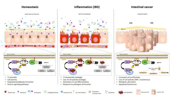 - López-Posadas, R.; Stürzl, M.; Atreya, I.; Neurath, M.F.; Britzen-Laurent, N. Interplay of Gtpases and Cytoskeleton in Cellular Barrier Defects During Gut Inflammation. Front. Immunol. 2017, 8, 1240. [Google Scholar] [CrossRef] [PubMed]