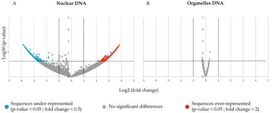 Volcano plots of exDNA from soybean var. Castetis differentially aligned in 1000 pb parts. (A): Nuclear DNA, (B): mitochondrial and plastidial DNA merged as “organelles DNA” owing to their similarity. (A,B): 1000 pb parts of the soybean genomic sequence are represented by a point. Each point is placed according to its Log2 of fold change and the absolute value of the Log10 of its p-value. A color is assigned to every point depending on its fold change and p-value. Grey points correspond to sequences with no significant differences between PEP-13 elicited and control conditions, blue points correspond to sequences that are under-represented in control condition (fold change < 0.5 (log2 fold change < −1), p-value < 0.05), and red points correspond to sequences that are over-represented in PEP-13.