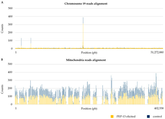 In order to examine alignment profiles, we realized read alignment graphics for each chromosome and organelle. Here, we show the example of chromosome 19 (Figure 3A) and mitochondria alignment (Figure 3B), which are representative of the other chromosomes and organelles, in control (dark blue) and PEP-13 elicited (yellow) conditions. For the nuclear sequence, we highlighted a baseline of nearly zero counts all along the chromosome sequence, which is similar between the two conditions. Secondly, we can see some 1000 pb parts showing higher alignment counts (almost 400 for the 24,013,001–24,014,000 pb part in control condition), which seemed slightly lower in the elicited condition than in the control condition. This 1000 pb part was not detected previously as a differentially represented part (FC > 2; p-value < 0.05) because there was no significant change between PEP-13 elicited and control conditions. For organelles’ alignments, we highlighted a high baseline (around 200 counts) all along the sequence, which also seemed slightly lower in the elicited condition compared with the control condition. According to the previous differential analysis (Figure 2), there was no significant change between the two conditions.