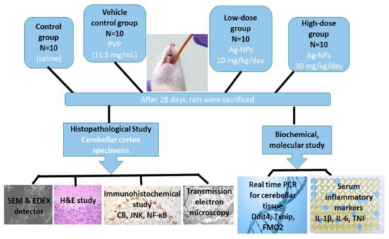Previous studies reported the adverse effects of Ag-NPs on different parts of the brain especially hippocampus. However, few in-vivo studies have focused on the cerebellar cortex especially the histopathological changes at ultrastructural level. Based on this background, the aim of the current study was to assess the impacts of Ag-NPs exposure on the cerebellar cortex of adult male albino rats especially changes at the ultrastructural level. We also investigated changes at the biochemical and molecular levels.