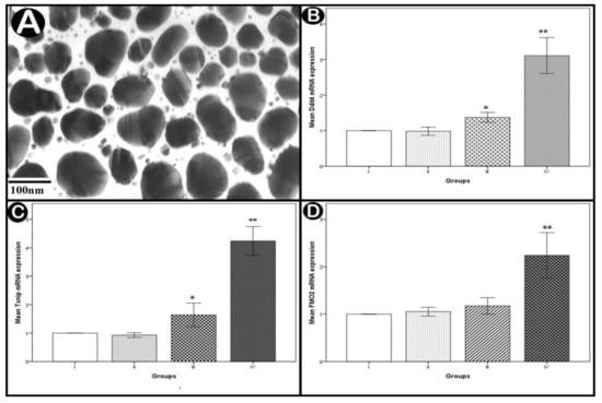 (A) TEM image showing average diameters of Ag-NPs. (B–D) real-time PCR analysis of mRNA expressions of DNA damage inducible transcript 4 (Ddit4), thioredoxin-interacting protein (Txnip) and flavin containing monooxygenase 2 (FMO2) in the cerebellar cortex. Values are expressed as mean ± standard deviation (X ± SD); *: Significant difference (p < 0.05) and **: Highly significant difference (p < 0.001); n = 10 animals.