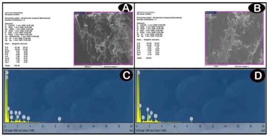 (A,B) SEM images; backscattered electron images show contrast due to different element compositions for low-dose and high dose groups, respectively. (C,D) analyses of EDX for detection of these elements and their relative amounts (atomic % and weight %) by the production of an X-ray spectrum from the whole scan area of the SEM. The Y-axis represents the sums of X-rays and the X-axis depicts their energy level (KeV). The elements are identified by the place of the peaks, while the height of the peaks is used to measure the quantity of each element. (C) low-dose group EDX spectrum shows a significant amount of Ag (one prominent peak at 3 KeV). (D) high-dose group EDX spectrum shows increased the amount of Ag compared with low-dose group (one prominent peak at 3 KeV).