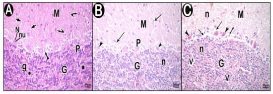 Hematoxylin and eosin (H&E)-stained sections in cerebellar cortex of the study groups. (A) control group. (B) low-dose group. (C) high-dose group. Outer molecular layer (M), fibers (short arrow), scattered cells (curved arrow), normal Purkinje cells (P), Bergmann astrocytes (tailed arrow), nuclei of Purkinje cells (N), nucleoli of Purkinje cells (nu), granular layer (G), granule cells (g), non-cellular cerebellar islands (asterisk), vacuolar spaces (arrow), atrophied shrunken Purkinje cells (arrow head), cells having darkly stained nuclei (n), areas of focal neuron loss (zigzag arrow) and vacuolations (V).