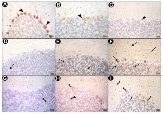 Immunohistochemically stained sections in cerebellar cortex of the study groups. (A,D,G) control group. (B,E,H) low-dose group. (C,F,I) high-dose group. (A–C) immune reactions for Calbindin D28k (CB) (arrow head). (D–F) c-Jun N-terminal kinase (JNK) immune-reactions (arrows). (G–I) nuclear factor kappa beta (NF-κB) immune reactions (tailed arrows).