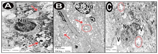 Electron micrographs of cerebellar cortex molecular layer. (A) control group. (B) low-dose group. (C) high-dose group. Axons (arrow), neurofilaments (F), neuroglia (Ng), vacuolated neuropil (circle) and vacuoles (V).