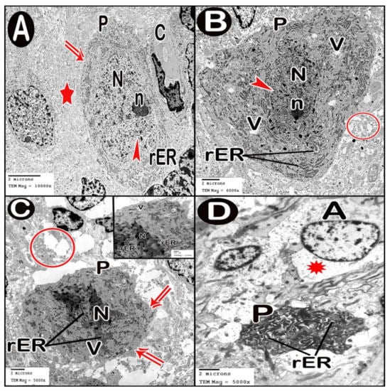 Electron micrographs of Purkinje cell layer. (A) control group. (B) low-dose group. (C,D) high-dose group. Purkinje cell (P), contour of cell membrane (double arrow), tight neuropil (star), blood capillary (C), nucleus (N) with indentation (arrow head), nucleolus (n), short profiles of rough endoplasmic reticulum cisternae (rER), swollen astrocytes (A) and loss of cytoplasmic organization (asterisk).