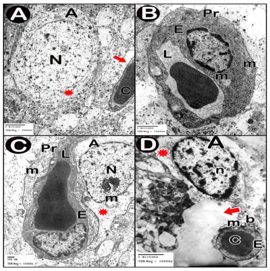 Electron micrographs of Blood brain barrier. (A,B) control group. (C) low-dose group. (D) high-dose group. Astrocyte (A), nucleus (N), cytoplasm (asterisk), blood capillary (C) separated by perivascular spaces (thick arrow), lumen of blood capillary (L), endothelial lining (E), mitochondria (m), pericyte cytoplasm (Pr), clumps of heterochromatin within and around the edge of the nucleus (n) and separation of the basement membrane (b).