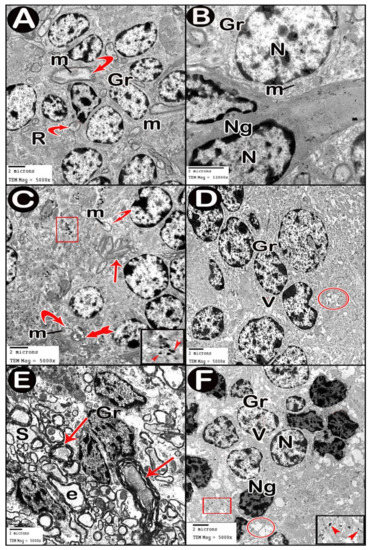 Electron micrographs of granular layer. (A,B) control group. (C,D) low-dose group. (E,F) high-dose group. Granule cells (Gr), mitochondria (m), mossy rosettes (R), neuroglia (Ng), normal myelinated fibers (curved arrow), disrupted myelin (tailed arrow), splitting of myelin sheaths (arrow), vacuoles (V), vacuolated neuropil (circle), ballooned or empty fibers (e) and wide spaces between the axons (S). Insets in C and F, magnifications of the boxed parts showing electron dense silver nanoparticles (arrow heads).