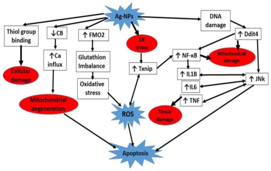 Cellular uptake of Ag-NPs occurs via active and passive transport; it includes phagocytosis, endocytosis, diffusion or direct penetration through the ion channel [8,9]. When Ag-NPs enter cells; they become more toxic than in the environment. Inside cells; nano-silver are converted from the elemental silver (Ag0), to Ag+ ions then to silver oxide species (Ag–O and, lastly, to silver sulfide species (Ag–S) that bind to thiols [10] However, in the environment, Ag-NPs enter sulfidation reactions to Ag2S, which decrease their toxicity [11].