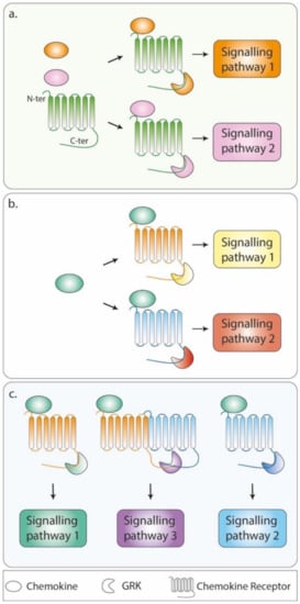 Taken together, these results prompted several hypotheses with regard to the regulatory role of GRKs in chemotaxis. Different GRKs might be recruited to the receptor upon chemokine binding and interact with distinct domains of the receptor, according to the availability of the other components of the signalling pathways that are activated (e.g., heterotrimeric G proteins, small G proteins and their exchange factors, extracellular receptor kinase mitogen-activated protein kinases (ERK1/2 and MAPKs)) (Figure 1a). This coordinated action of different GRKs would be translated into distinct biological outcomes upon phosphorylation barcoding [,,], which is envisioned as a general signalling hub that would be biased by the conformation of the receptor notably induced by the binding of arrestins and cellular effectors, the nature of the chemokine ligand (Figure 1b) and the possible allosteric interactions with other receptors (i.e., oligomerization, Figure 1c), including atypical chemokine receptors, which are known for their regulatory effect on chemoattractant signals. Functional evidence for this concept of phosphorylation barcoding was provided by recent studies revealing that switching the code pattern of phosphosites between GPCRs reprograms arrestin activation [,].