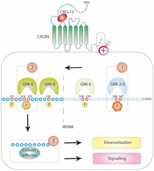 The disruption of the phosphorylation barcode through mutations in the C-ter of a chemokine receptor may have serious pathological consequences, as illustrated by WHIM syndrome. This syndrome is the first example of a human disorder mediated by dysfunctions of a chemokine receptor, namely CXCR4, and is mostly linked to inherited heterozygous autosomal dominant mutations in the CXCR4 gene []. All eleven mutations described among the 105 patients reported to date target the domain encoding the receptor C-ter, mostly premature stop codons that eliminate the last 10 to 19 C-ter residues, some frameshifts that introduce 3 to 24 additional new amino acids and one missense mutation [,]. Impaired CXCR4 internalization upon CXCL12 stimulation is a hallmark of patient-derived cells and cell lines expressing WHIM-associated mutants [,], despite the conservation of some phosphosites (e.g., serine residues Ser324/Ser325). This phenomenon might be attributed to the proposed hierarchical organization of CXCR4 C-ter phosphosites, whereby CXCL12-induced phosphorylation at Ser324/Ser325 residues depends on the phosphorylation of more distal residues (i.e., Ser346/Ser347 residues) that are deleted in WHIM-associated mutants [] (Figure 2). Along this line, Nakai et al. recently provided a model of this type of modulatory process whereby CXCL12-induced murine B cell chemotaxis is associated with the phosphorylation of the CXCR4 C-ter by GRK2/3, and then, the recruitment of the COMMD3/8 complex, a potential susceptibility factor for inflammation [], promotes the recruitment of GRK6 that will subsequently phosphorylate far CXCR4 C-ter residues and promote β-arrestin 2 binding []. Similar findings were reported for the β2-adrenergic receptor [], which is also involved in inflammation [], supporting the general interplay between GRK3, GRK6 and arrestin-mediated signalling.