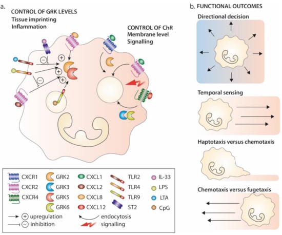 The spatial and temporal contributions of chemokines and/or other chemoattractants (e.g., C5a, LTB4 and formylated peptides) to the migratory modes of neutrophils either during homeostasis or in the course of the transmigration of neutrophils through the endothelium into inflamed tissues has been recently discussed by Lämmermann and Kastenmüller []. Several studies have identified changes in GRK expression levels induced by pathological conditions, of which sepsis, a complex clinical condition that arises in response to severe microbial infection or extensive tissue damage, is the most studied condition. Neutrophils from septic patients have been reported to express increased levels of GRK2 and GRK5, a pattern that was reproduced in vitro upon neutrophil exposure to CXCL8 or LTB4 in the presence of inflammatory cytokines [] (Figure 3a). In experimental mouse models of sepsis, GRK2 upregulation in neutrophils was associated with the decreased expression of CXCR2 at the cell surface and a subsequent decrease in the migration of neutrophils to infection sites, resulting in shorter survival of the mice [,,,]. These observations most notably have led to the identification of several cellular receptors as potential susceptibility factors for the pathophysiology of sepsis, such as Toll-like receptors (TLRs). However, interleukin-33 (IL-33) has therapeutic potential in view of its capacity to antagonize the TLR4-dependent modulation of interrelated GRK2 and CXCR2 activities in a mouse model of sepsis and in human neutrophils [], as also suggested for fibrates, which are ligands of peroxisome proliferator-activated receptor-alpha []. An early study suggested an additional level of control as a possible feedback control loop through which the engagement of TLR4 by LPS limited CXCL2-induced GRK2 and GRK5 upregulation and the subsequent CXCR2 desensitization []. Recent studies capitalized on unbiased methods to identify biomarkers and susceptibility factors for sepsis [], as notably illustrated by a comparative kinome profiling approach in patients suffering from systemic inflammatory response syndrome, suggesting that different kinases are activated according to the infectious states of the patients [], although the small effective sample of patients does not allow us to interlink these changes to the manifestation or progression of the disease.