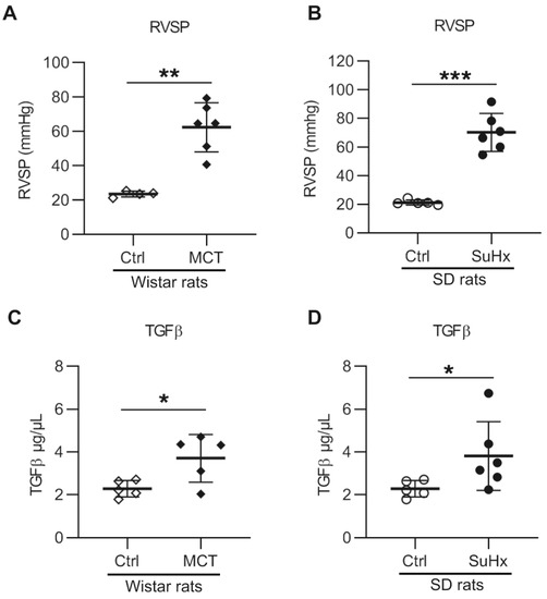 Right ventricle (RV) systolic pressure and serum transforming growth factor-β 1 (TGF-β1) levels in animal models with pulmonary arterial hypertension: (A) RV systolic pressure (RVSP) in monocrotaline (MCT) rats. n(Ctrl) = 4, n(MCT) = 6; (B) RVSP in sugen–hypoxia (SuHx) rats. n(Ctrl) = 5, n(SuHx) = 6; (C) serum TGF-β1 level in MCT rats. n(Ctrl) = 5, n(MCT) = 5; (D) serum TGF-β1 level in SuHx rats. n(Ctrl) = 5, n(SuHx) = 6. * p < 0.05, ** p < 0.01, *** p < 0.001.