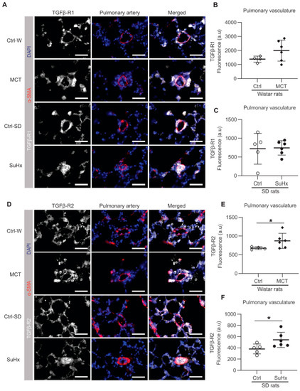 Immunofluorescence in pulmonary vasculature. (A) Representative images of immunofluorescence for transforming growth factor-β receptor 1 (TGFβR1); white = TGFβR1; red = α-SMA; blue = nuclei. (B,C) show the quantification data of TGFβR1 expression within the area co-stained with α-SMA; (D) representative immunofluorescent images for TGFβR2; white = TGFβR2; red = α-SMA; blue = nuclei; (E,F) shows the quantification data of TGFβR2 expression within the area co-stained with α-SMA. Ctrl: control rats, MCT: monocrotaline rats, SuHx: sugen–hypoxia rats, SD rats: Sprague Dawley rats, α-SMA=alpha smooth muscle actin. Scale bar = 50 μm. Wistar rats: n(ctrl) = 4, n(MCT) = 6. SD rats: n(ctrl) = 5, n(SuHx) = 6. * p < 0.05.