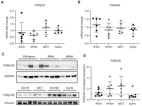 The expression of transforming growth factor-β receptors (TGFβR): (A) the mRNA expression of TGFβR1 analyzed by qPCR; (B) the mRNA expression of TGFβR2 analyzed by qPCR. n(iPAH) = 6, n(hPAH) = 6, n(MCT) = 5, n(SuHx) = 5; (C) representative image of Western blot analysis in whole lung lysates; (D) quantification data of Western blot analysis normalized to vinculin. n(iPAH) = 7, n(hPAH) = 7, n(MCT) = 6, n(SuHx) = 6. Quantification in each group is the fold change corrected by its own control group. The control group of iPAH and hPAH: donors without PAH. The control group of MCT: healthy Wistar rats. The control group of SuHx: healthy Sprague Dawley rats. iPAH: idiopathic pulmonary arterial hypertension, hPAH: hereditary pulmonary arterial hypertension, Ctrl: control, MCT: monocrotaline rats, SuHx: sugen–hypoxia rats. * p < 0.05, compared to its respective control group.