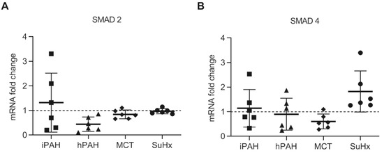 The mRNA expression of SMAD2 and SMAD4 in the whole lung lysate analyzed by qPCR: (A) the mRNA expression of SMAD2/3 in human PAH patients and animal PAH models; (B) the mRNA expression of SMAD4. n(iPAH) = 6, n(hPAH) = 6, n(MCT) = 6, n(SuHx) = 6. iPAH: idiopathic pulmonary arterial hypertension, hPAH: hereditary pulmonary arterial hypertension, Ctrl: control, MCT: monocrotaline rats, SuHx: sugen–hypoxia rats. The control group of iPAH and hPAH: donors without PAH. The control group of MCT: healthy Wistar rats. The control group of SuHx: healthy Sprague Dawley rats.