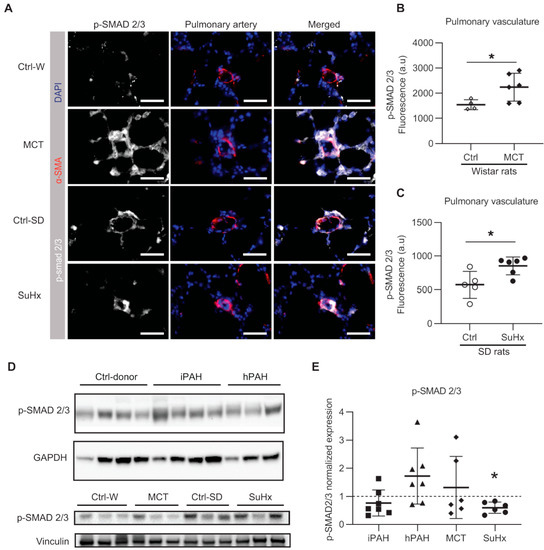 The phosphorylation of SMAD2/3 in human PAH and animal models of PAH: (A) representative immunofluorescent images; white = pSMAD2/3; red = α-SMA; blue = nuclei. Scale bar = 50 μm; (B) quantified data of pSMAD2/3 expression within the area co-stained with α-SMA in MCT rats. Wistar rats: n(ctrl) = 4, n(MCT) = 6; (C) quantified data of pSMAD2/3 expression within the area co-stained with α-SMA in SuHx rats. SD rats: n(ctrl) = 5, n(SuHx) = 6; (D) representative images of Western blot analysis in whole lung lysates. (E) The quantification data of phospho-SMAD (pSMAD) 2/3 expression normalized to vinculin. n(iPAH) = 7, n(hPAH) = 7, n(MCT) = 6, n(SuHx) = 6. iPAH: idiopathic pulmonary arterial hypertension, hPAH: hereditary pulmonary arterial hypertension, Ctrl: control, MCT: monocrotaline rats, SuHx: sugen–hypoxia rats. * p < 0.05.