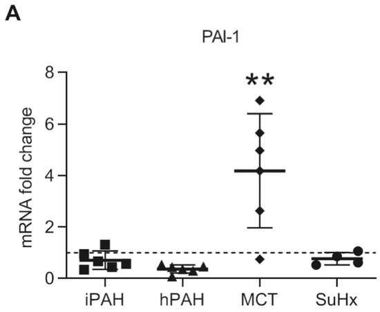 The mRNA expression of plasminogen activator inhibitor-1 in whole lung lysates was analyzed by qPCR. n(iPAH) = 6, n(hPAH) = 6, n(MCT) = 6, n(SuHx) = 4. ** p < 0.01.