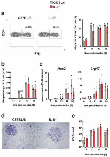 3.1.3. The Overall TH1 Immune Response and Subsequent Macrophage Effector Mechanism Are Not Impaired in Mtb-Infected IL-6−/− Mice