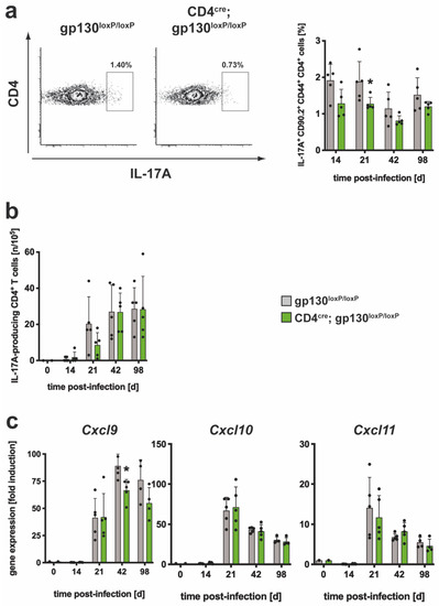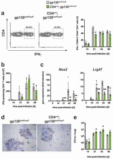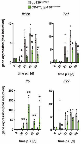 3.2.1. Gene Expression of Il12b, Tnf and Il27 was Decreased Whereas mRNA Levels of Il6 were Elevated in Mtb-Infected CD4cre; gp130loxP/loxP Mice