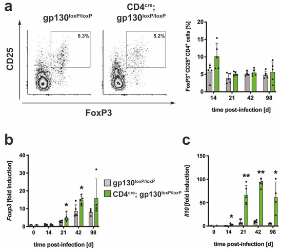 3.2.3. The Regulatory Immune Response in Mtb-Infected CD4cre; gp130loxP/loxP Mice