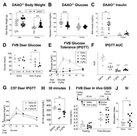 Procedures for the in vivo assessment of glucose homeostasis have been previously described [1,26]. In brief, intraperitoneal glucose tolerance (IPGTT) and insulin tolerance testing (ITT) were tested by monitoring tail vein blood glucose before and after an i.p. bolus of glucose (2 g/kg at 0.5 g/mL, Pfizer, New York City, NY, USA) or insulin (0.75 U/kg at 0.1 U/mL, Humalog, Eli Lilly, Indianapolis, IN, USA) in 14-h or 6-h fasted mice, respectively. For in vivo GSIS, facial vein blood was collected from overnight fasted animals and 3 min after a 3 g/kg i.p. injection of glucose. For some experiments, i.p. D-serine (Sigma Aldrich, St. Louis, MO, USA, 1, 2 or 3 g/kg at 0.1, 0.2 or 0.3 g/mL in saline, respectively) or a saline control was administered in conjunction with these tests, as described in the text. Plasma was collected by facial vein into EDTA-coated tubes and assayed with the ALPCO Ultrasensitive Mouse Insulin ELISA according to kit instructions. Figure 1 experiments on DAAO−/− mice included blood glucose and body weight data collected from the entire colony of adjacently reared mutant and ddY WT mice between 3 and 14 months of age on 2 occasions approximately 1 year apart. The remaining tests were assessed in the colony at a single timepoint. Plasma insulin was determined by facial vein blood samples in randomly fed animals or after a 4–6 h fast in DAAO−/− mice and controls. The detection of D-serine by capillary electrophoresis in the facial vein serum of random fed mice from this colony was thoroughly described in a previous publication [27].