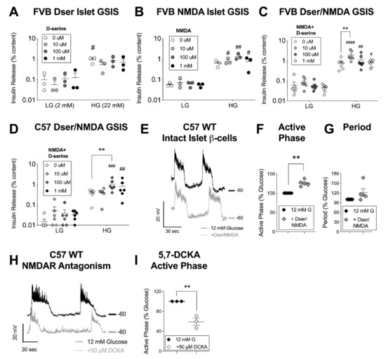 In vitro insulin and β-cell membrane responses to N-methyl D-aspartate receptor (NMDAR) activation with D-serine co-agonism. Isolated islets from FVB mice were assessed for insulin secretion (as % islet insulin content) in response to low glucose (LG, 2 mM), high glucose (HG, 22 mM), and a concentration range of (A) D-serine, (B) NMDA, or (C) a range of D-serine with 100 μM NMDA. (D) D-serine + 100 μM NMDA glucose-stimulated insulin secretion (GSIS) experiments were repeated with C57 mouse strain-derived islets. A perforated patch clamp technique was used to record β-cell membrane potentials from intact C57 WT islets. (E) Representative traces show oscillations from the same cell ~10 min after incubation in 12 mM glucose (black) and ~ 1 min after exposure to 100 μM each of Dser/NMDA (grey); −60 mV level is shown for each trace. (F) Active phase duration (width of depolarized plateau) and (G) period between the start of each oscillation was analyzed just before and after treatment. (H) Representative traces from a similar experiment on islet β-cells before and after treatment with the NMDAR (GluN1) D-serine binding site antagonist 5,7-dichlorokynurenic acid (5,7-DCKA) and (I) a quantitative analysis of active phase duration. Data in circles was derived from male animals and data in diamonds were mixed sex. Islet GSIS was statistically analyzed by 2-way ANOVA (glucose × treatment) with repeated measures. Oscillation characteristics (normalized to the glucose baseline on a per cell basis) were assessed by 1-sample t-test. # p < 0.05, ## p < 0.01, ###p <0.001, #### p < 0.0001 vs. similar condition LG level. ** p < 0.01 vs. control, as indicated. GSIS data is presented on a y-axis logarithmic scale to facilitate evaluation of LG values.