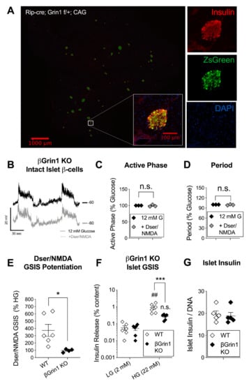 Dser/NMDA membrane and functional responses in a mouse model with β-cell specific GluN1 loss. Ins2-driven Cre-Lox recombination of the Grin1 gene (Rip-cre; Grin1 f/f, βGrin1 KO) was used to achieve β-cell specific loss of D-serine-binding GluN1 protein (and thus all NMDARs) in C57 mice. (A) Immunofluorescent staining of a fixed pancreatic slice (10x, left) and a single islet (20x, right) from a Rip-cre; Grin1 f/+ mouse bred with a CAG-ZsGreen reporter gene showing colocalization of Cre-driven green fluorescence and β-cell insulin signals. (B) Representative recordings of glucose-stimulated (12 mM) membrane voltage oscillations in β-cells from intact βGrin1 KO islets immediately before (black) and ~1 min after D-serine/NMDA (100 μM each, grey) with a comparative quantification of (C) active phase duration and (D) period. (E) The relative effect of the same concentration of D-serine/NMDA on GSIS (22 mM glucose) in WT (Cre-negative; Grin1 f/f or Grin1 f/+) and βGrin1 KO islets and the effect of genotype on islet (F) insulin secretion and (G) insulin content in an independent GSIS experiment. Data in panels C, D were analyzed by 1-sample t-test and in E, G by independent 2-tailed t-test. Data in panel F were analyzed by repeated measures 2-way ANOVA. Not significant (n.s.) p > 0.05, ## p < 0.01 vs. w/in genotype LG or as indicated. * p < 0.05, *** p < 0.001 vs. WT.