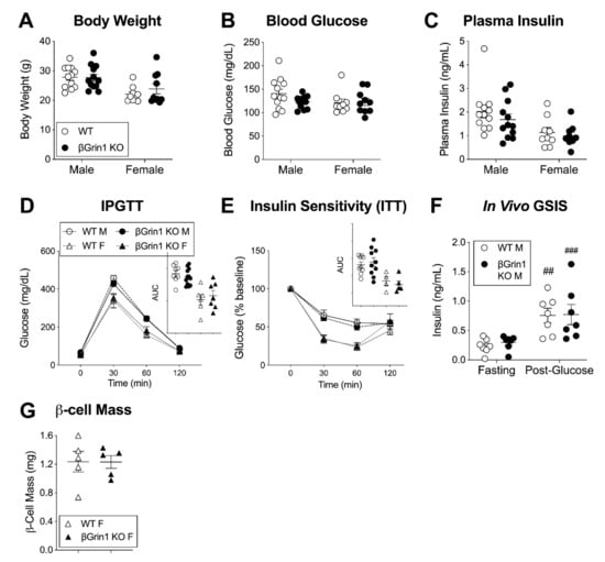 In vivo metabolic phenotype of young adult βGrin1 KO mice. WT and βGrin1 KO male and female mice were separately evaluated for random fed (A) body weight, (B) blood glucose, and (C) plasma insulin. (D) Glucose tolerance was assessed in male (circles) and female (triangles) overnight fasted mice and (E) insulin sensitivity in 6-h fasted mice following 0.75 U/kg ip insulin. (F) An in vivo GSIS was also conducted in male mice and (G) β-cell mass was determined by immunofluorescent insulin staining of fixed pancreatic sections from female mice. Statistically, single endpoint data (A–C,G), AUC) was assessed by independent 2-tailed t-test and multi-endpoint data (D–F) by repeated measures 2-way ANOVA for each sex. ## p < 0.01, ### p < 0.001 vs. w/in genotype fasting level. ITT = Insulin tolerance test. Cre-negative (Grin1 f/f or Grin1 f/+) mice were used as WT controls.