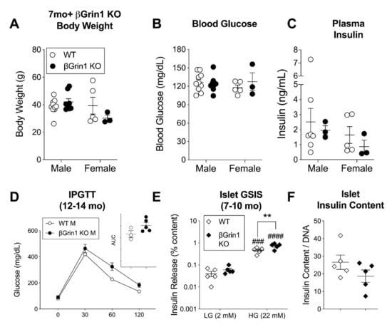 In vivo phenotype of older adult βGrin1 KO mice. Male and female βGrin1 KO and WT mice, aged 7–14 months, were assessed for measures of glucose homeostasis including (A) random fed body weight, (B) blood glucose, and (C) plasma insulin; (D) 12–14-month-old males were also given an IPGTT with AUC shown in the inset. Islet data derived from 7–10-month-old male and female mice from each genotype was combined (diamonds) to show (E) islet insulin secretion by GSIS and (F) total islet insulin content. Statistical analysis was as described for similar data in previous figures, with independent Student t-tests and repeated measures 2-way ANOVA for within sex single and multi-endpoint data, respectively. ### p < 0.001, #### p < 0.0001 vs. within group LG. ** p < 0.01 vs. WT, as indicated. Figure legend defines all subsequent panels until re-defined. Cre-negative (Grin1 f/f or Grin1 f/+) mice were used as WT controls.