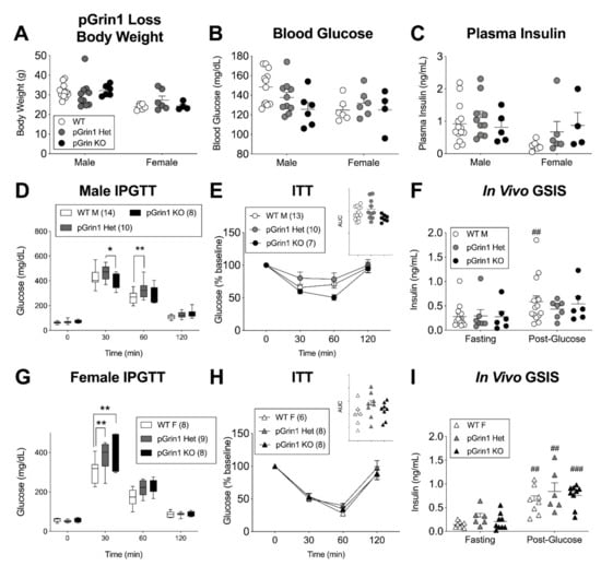 We saw no differences between WT, pGrin1 Het, and pGrin1 KO random fed body weight, blood glucose, or plasma insulin levels for either sex (Figure 6A–C). In males, there was a small but significant improvement in pGrin1 KO IPGTT glucose tolerance at 30 min relative to pGrin1 Het, which reflects the previously published model results [6], but we also saw glucose intolerance at 60 min between the WT and pGrin1 Het males in the same test (Figure 6D). During insulin tolerance testing, genotype neared significance as a factor (p = 0.07 by 2-way ANOVA) with pGrin1 KO trending towards increased sensitivity (Figure 6E). Similarly, the change in insulin release between post-glucose and fasting glucose was somewhat more robust in the WT mice vs. the GluN1 loss models, but ultimately neither insulin sensitivity nor in vivo GSIS were demonstrably different between male groups (Figure 6F). In the female mice, we found more consistent evidence of glucose intolerance for both pGrin1 Het and pGrin1 KO mice compared to WT controls at the 30-min IPGTT timepoint (Figure 6G), but insulin sensitivity and in vivo GSIS were unaffected (Figure 6H). In sum, pancreas-wide deletion of GluN1 in young adult mice resulted in several indicators of glucose intolerance, and some trends in male mice consistent with insulin hyposecretion, although the potential influence of glucose-regulating NMDAR activity in the hypothalamus [46], where Cre expression has been demonstrated for both our promoter constructs [47,48], cannot be ruled out.