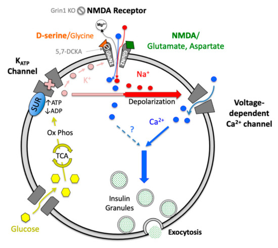 The current investigation showed that acute systemic D-serine lowered blood glucose and increased in vivo insulin secretion in mice. D-serine also potentiated islet insulin secretion in vitro, but only when exogenous conditions were provided to ensure the capacity for NMDAR activation—high glucose to stimulate local membrane depolarization, the simultaneous presence of both agonist (NMDA) and a sufficient concentration of co-agonist (D-serine) and β-cell expression of the co-agonist binding GluN1 receptor subunit. D-serine-mediated NMDAR activation resulted in an acute enhancement of β-cell membrane excitation characteristics, in a pattern similar to other endogenous GSIS-enhancing agents [49]. These data are consistent with a classical model of NMDARs in the CNS in which the receptor-channel’s facilitation of positive intracellular ionic flux enhances membrane excitability and strengthens the relationship between synaptic signaling and neurotransmitter exocytosis. Such a system is easily envisioned within the canonical β-cell stimulus-secretion pathway, falling between KATP channel closure and the activation of L-type Ca2+ channels, possibly also contributing to net [Ca2+]i, to enhance glucose-stimulated insulin secretion (Figure 7).