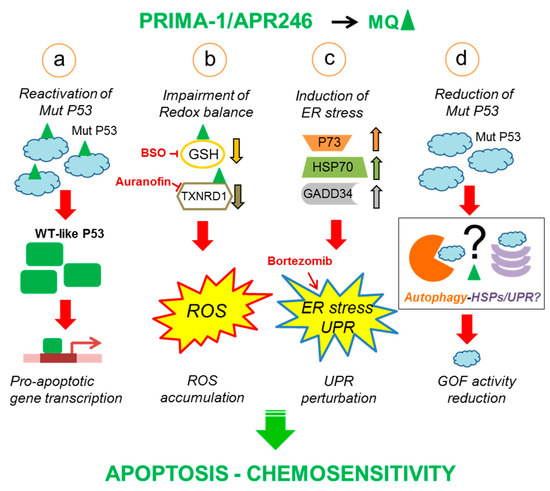 PRIMA-1/APR246 activities reported in hematological tumor cells. The main activities of PRIMA-1/APR246 leading to apoptosis induction and cell death are depicted: (a) the reactivation of mutant P53, leading to the expression of P53 target genes and apoptosis induction; (b) the perturbation of redox balance mediated by a reduction of GSH level and TXNRD1 activity due to direct binding of the PRIMA-1/APR246 reactive compound MQ; molecules that can further impair GSH and TXNRD1 activity (BSO and Auranofin, respectively) are indicated; (c) the induction of ER stress and UPR mediated by upregulation of HSP70, GADD34, and P73; bortezomib able to enhance the UPR and synergize with APR246 to increase tumor cell death is indicated; (d) the reduction of mutant P53 levels through unknown pathways (black box) that may result in the decrease of mutant P53 GOF activity. ROS, reactive oxygen species; HSPs, heat shock proteins; UPR, unfolded protein response; ER, endoplasmic reticulum; Mut P53 (mutant P53); WT (wild-type).