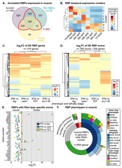 RNA binding proteins (RBPs) have fiber-type and temporal dependent expression patterns in muscle. (A) Comparison of RBPs from AmiGO (purple), GLAD (yellow) or RNA-interactome capture (RIC, cyan) annotations that are expressed in mRNA-Seq data from 1 d adult Drosophila indirect flight muscle (IFM), tergal depressor of the trochanter (TDT) or leg. A core set of 568 RBPs (red) are expressed in muscle and present in at least two annotations. (B) Heatmap of RBP temporal expression profiles identified from Mfuzz clustering of IFM mRNA-Seq timecourse data. Core expression profiles, the average of standard normalized count values for each cluster, cluster into three distinct temporal expression patterns. (C) Heatmap and hierarchical clustering of log2 fold change (log2FC) values from DESeq2 differential expression analysis of RBP genes between wild-type IFM and leg, TDT, salm−/− IFM or bru1-IR IFM. (D) Heatmap and hierarchical clustering of log2FC values from DEXSeq differential exon usage analysis of RBP gene exons between wild-type IFM and leg, TDT, salm−/− IFM or bru1-IR IFM. (E) RBP genes with exons that are differentially expressed between tubular and fibrillar fiber types. Exons with positive log2FC values are fibrillar preferential, while negative log2FC values are tubular preferential, as detected in DEXSeq comparison of wild-type IFM and leg (purple), TDT (yellow) or salm−/− IFM (cyan). (F) Sunburst plot of RBP phenotypes in muscle from a published genome-wide RNAi screen [86]. The inner ring summarizes lethality and flight phenotypes. The second ring depicts the stage of lethality. The third and fourth rings summarize myofiber (magenta) and sarcomere (yellow) phenotypes, respectively.