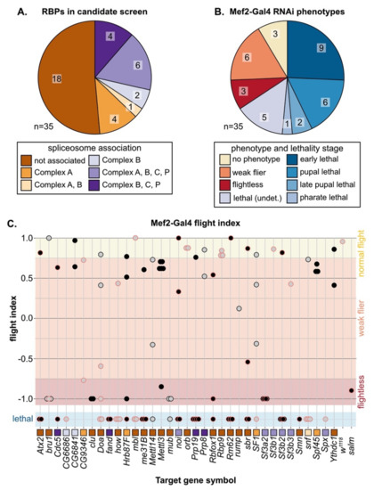 As expected, based on the essential requirement for splicing in all cells, we observed that muscle-specific knockdown of many spliceosome components is lethal. A total of 50% (22 of 44) of hairpins crossed to Mef2-Gal4 were lethal in early pupal or pre-pupal stages and 62% (18 of 29) of hairpins crossed to Act88F-Gal4 were lethal at late pupal stages (Figure 5A, Figure S4C). We observed that only 15% of hairpins (2 of 13) targeting A-complex components as compared to 65% of hairpins (20 of 31) targeting B-complex components had lethal phenotypes when crossed to Mef2-Gal4 (Figure S4C). We observed the opposite with impaired flight ability, where 38% of hairpins (5 of 13) targeting A-complex components as compared to 6% of hairpins (2 of 31) targeting B-complex components were flight impaired (Figure S4C). One possible explanation for this result that remains to be tested in future experiments is that loss of specific E or A-complex components may lead to alternative splicing defects that impair muscle development and function, while loss of B-complex components results in a general block of splicing.