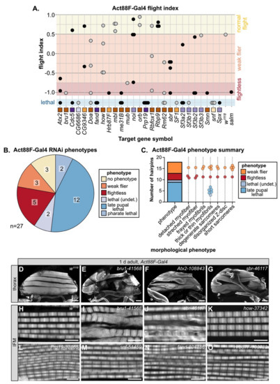 3.5. Temporally Restricted Knockdown of RBPs in IFM Using Act88F-Gal4