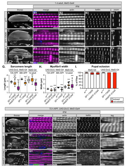 3.7. SF1 and Hrb87F Are Necessary for Myofibril Development and Z-disc Integrity