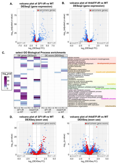 To characterize the transcriptomic phenotype and identify possible developmental mechanisms that disrupt myofibril structure after knockdown with SF1-13426 and Hrb87F-31244, we performed mRNA-Seq. We dissected IFM at 72h APF from Mef2-Gal4 driven knockdown flies, as well as from Mef2-Gal4 crossed to w1118 as a wild-type (WT) control. We analyzed differential gene expression between knockdown and WT IFM using DESeq2 [95] and differential exon use with DEXSeq [96]. Differential exon use reflects differential mRNA isoform use due to either alternative splicing or alternative promoter use. We also specifically examined a set of previously annotated genes encoding Drosophila sarcomere proteins [57] in these data. We were able to detect changes in both gene expression (Figure 7A,B) and exon use (Figure 7D,E) in IFM after knockdown with SF1-13426 and Hrb87F-31244.