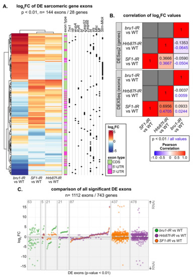 SF1 and Hrb87F are both A-complex components required for splice site recognition, but one recognizes the branch point and the other the 3’-SS. To test if their splicing signatures are distinct as well as how they differ from a non-spliceosome associated muscle-specific splicing factor, we compared gene expression and exon use patterns in SF1-IR, Hrb87F-IR and bru1-IR. Bruno1 (Bru1) is a CELF-family homologue known to regulate alternative splicing important for sarcomere assembly and contractility in IFM [75,81]. We started by calculating the Pearson coefficient for pairwise comparison of the significant fold change values and found a weak positive correlation of 0.3666 between SF1-IR and Hrb87F-IR at the gene level, which increased to 0.6956 at the exon level (Figure 8B). By comparison, bru1-IR has little or no correlation to SF1-IR or Hrb87F-IR. Genes that are downregulated in SF1-IR are also downregulated in Hrb87F-IR, but genes that are upregulated in SF1-IR are largely unchanged in Hrb87F-IR (Figure S6A). As Bru1 contributes to the regulation of fiber-type identity, we also looked at genes that are significantly differentially expressed between tubular and fibrillar muscle. Although bru1-IR leads to upregulation of tubular genes and downregulation of fibrillar genes, SF1-IR and Hrb87F-IR do not (Figure S6B), indicating they are not involved in regulation of fiber-type identity.